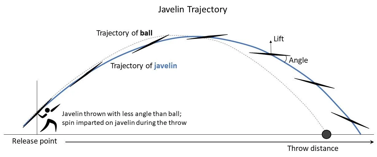 Trajectory of the javelin. The angle of the javelin relative to the air creates lift like an airplane wing. Getting the javelin angles right - taking into account the wind speed and direction - is key to getting the javelin to fly well. Here, the flight of the javelin is compared to the flight of a ball, which can’t fly at all.
